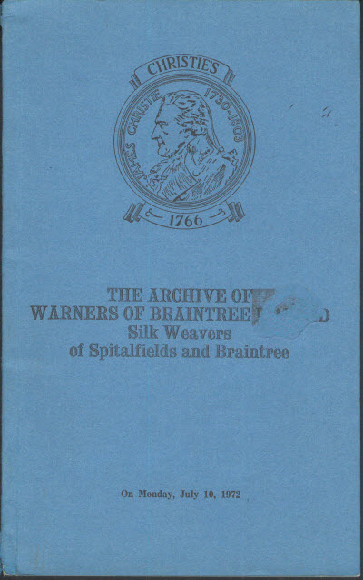 Octavo. 37 pp; 4 b/w photographs. 177 lots. Stiff blue card covers. VG-, small abraded area on front cover due to label removal. Sale of 18th and early 19th century designs and sample pattern books collected by Mr. Benjamin Warner and production records of the Warner Silk Weaving Mills. Sale held Monday, July 10, 1972.